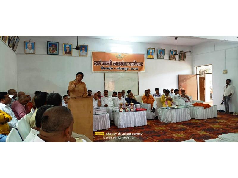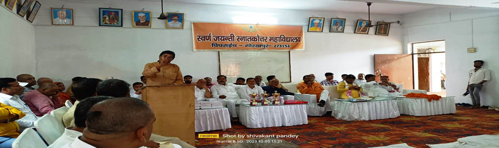 स्वर्ण जयन्ती स्नातकोत्तर महाविद्यालय, पिपराइच, जनपद - गोरखपुर का उद्देश्य सभी योग्य और वांछित छात्रों को उच्च शिक्षा उपलब्ध कराना है। कॉलेज के पास प्रख्यात शिक्षाविदों, पेशेवरों और कुशल संकाय सदस्यों के पूर्ण-शासी निकाय हैं जो अपने छात्रों को गुणवत्तापूर्ण शिक्षा कौशल और योग्यता प्रदान करते हैं। समय-समय पर विभिन्न कार्यशालाओं, सम्मेलनों, सेमिनारों, अतिथि व्याख्यान और अन्य शैक्षिक कार्यक्रमों का आयोजन किया जाता है ताकि छात्रों को उनके अध्ययन के क्षेत्र में नवीनतम घटनाओं के बारे में पता चले। शिक्षण की आधुनिक पद्धति का उपयोग छात्रों में सीखने की रुचि जगाने के लिए किया जाता है। पेशेवर पाठ्यक्रम जैसे बी.एड. इसकी ताकत में से एक हैं जो पेशेवर क्षमता के साथ ... और पढ़ें